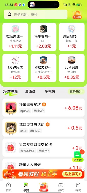 3、悬赏赚,简单的小任务,快至几十秒的时间完成,轻松得奖励。