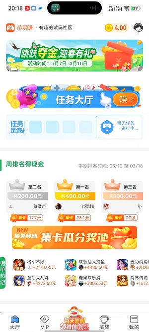 4、 试玩游戏周排名,前十名都有机会获得额外红包。