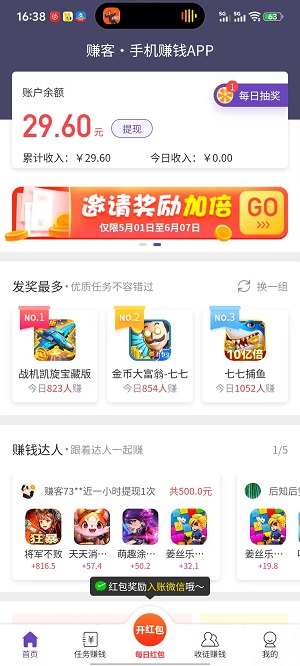 赚客app是一款可以手机赚钱的任务试玩体验平台,多年的APP运营经验,用户可以通过平台内的各种任务,应用试玩、游戏试玩等,完成体验就可以获得收益奖励。没有什么操作难度,新手也能轻松的搞定任务。任务接取到就是奖励赚到,另外每天还会不停的更新任务,让大家可以持续的赚到奖励。参与平台的每日福利活动,更有大量的福利好礼等着你。