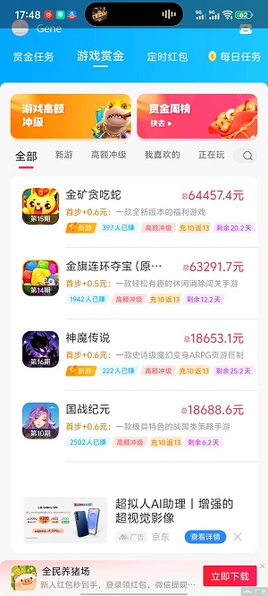 3、 还有游戏任务,可以边玩游戏边得奖励,并且奖励丰厚。