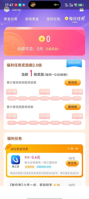 5、 每日任务,完成每日的任务,还可以提高倍数奖励,方式非常简单。