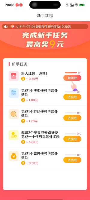 1、 动动手指手机也能赚零钱,新人注册领0.5元红包。
