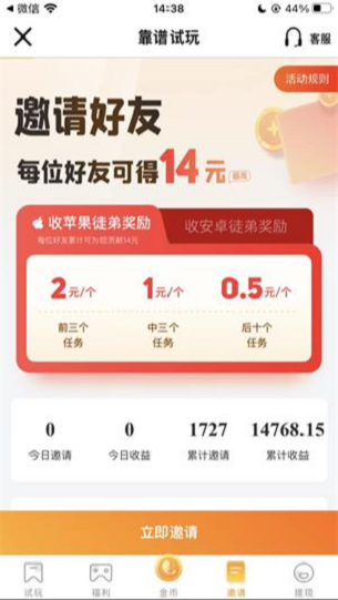 靠谱试玩ios,一款可以通过试玩应用赚钱的平台。这里有许多好玩的应用,用户可以接取试玩任务,只需轻松的完成试玩,就可以获得试玩奖励。不仅自己可以玩到一些好玩有趣的应用,还可以在闲余时间赚上零花钱,并且...
