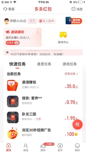 多多红包ios,它是一款苹果试玩赚钱平台。通过试玩体验应用,就可以获得试玩的奖励。并且可以快速的完成,平均一个的任务只需几分钟的时间来做,可以说是毫无时间压力。无论是上班族还是学生党,它都可以适合。无需任何的费用套路,直接下载打开就可以试玩赚钱。