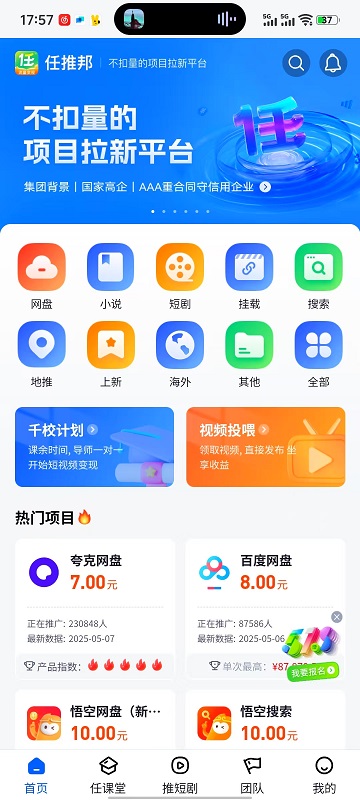 任推邦app,是一款以地推、网络推为主的流量变现平台。汇集了各种的网络推广项目,例如网盘拉新、外卖、短剧、视频会员等等的推广项目。只要你有流量推广能力,那么这些的项目都是为你创造收益的机会。而且不同的...