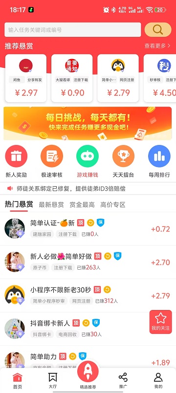 企鹅互助app,是一款聚合了海量威客任务的平台。用户可以在平台接取这些任务,并且当你根据任务的需求完成后,就可以获得对应的任务赏金奖励。简单的下载app打开首页,就能在首页看到许多的任务列表。并且平台的任务是完全免费接取,没有任何的接取门槛。每一个的任务都有详细的任务步骤要求,你只需根据步骤来完成即可,奖励轻松的赚到手。还有各种的玩法,邀请收徒、每日任务、游戏赚钱等等,快来下载试一试吧。