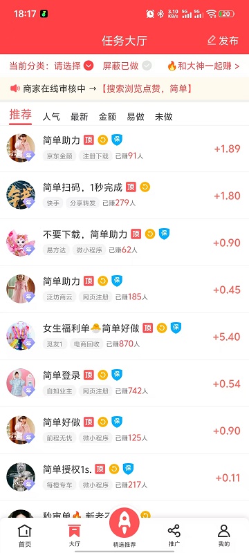 2、打开app首页即可看到任务列表,包括各种类型的任务。