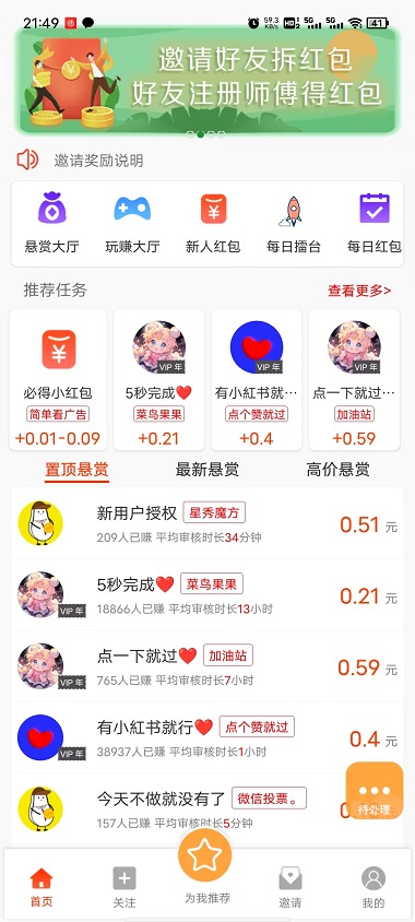 小白赚钱app,是一款可以赚钱的悬赏任务平台。通过互帮互助的方式,帮人忙也能赚奖励。平台的任务类型很多,不同的任务都有不同的完成步骤,用户只需根据任务的需求来完成任务,就可以获得任务佣金奖励。每天都有大量的任务更新,只要你有时间随时都可以来做,感兴趣的小伙伴不要错过。