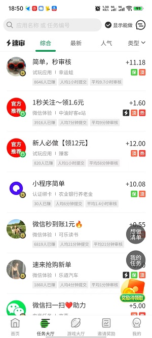 4、 平台有60秒速审任务板块,完成任务通过审核只需60秒。