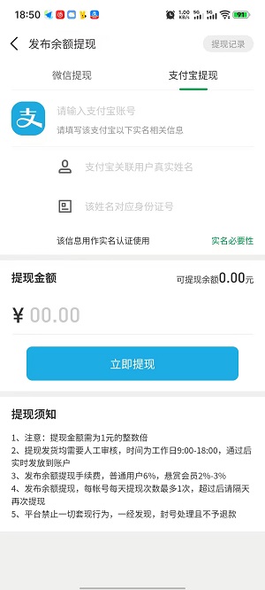 悬赏蛙内的悬赏任务多多,用户可以任意的接取赚奖励,提现只需满1元就可以申请,可以兑换到微信或支付宝钱包,需要一个工作日审核到账。