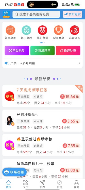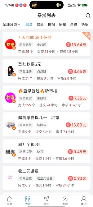 2、 悬赏任务数量超多,多到做不完,用户可以任意接取。