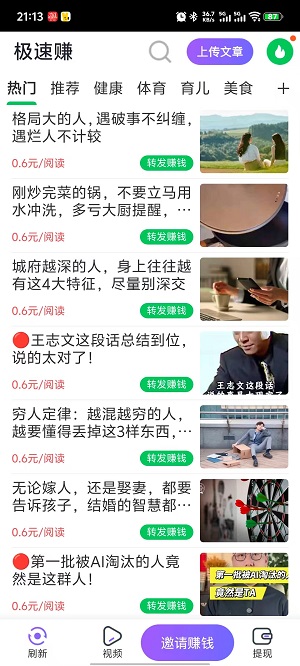 极速赚是一款可以分享文章赚收益的app,平台里面有着大量的资讯文章,包含健康、体育、美食、汽车、情感等等类型的优质文章,不仅自己可以阅读学到知识。分享文章出去,朋友或是其他人阅读了,你还能获得阅读奖励。且文章每天都有更新,保证软件文章的时效性,让有价值的文章更有价值,感兴趣的小伙伴赶紧下载起来吧。