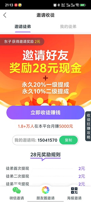 4、 邀请赚钱,通过邀请好友,可以获得28元红包+好友的分享提成。