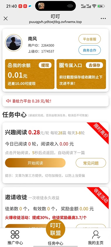 叮叮联盟app,一款可以微信阅读赚钱的平台。无需下载app,直接微信扫码即可开玩。只需自己阅读文章,就可以获得一定的阅读奖励。5秒阅读后,自动阅读下一批的文章,可以是半自动的赚奖励。另外平台还有多种的...